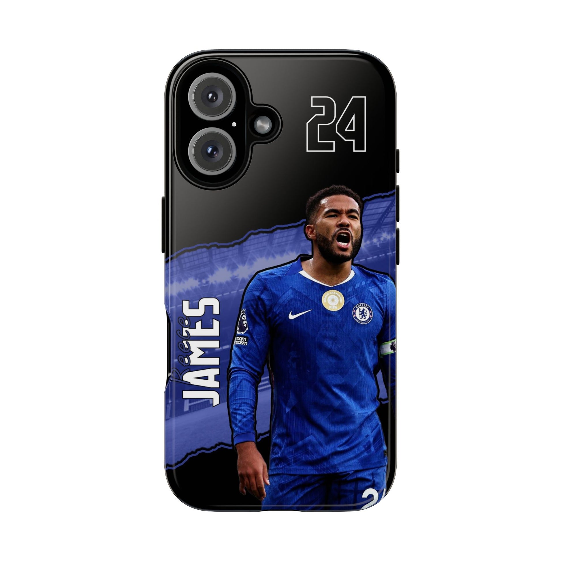 A plastic phone case featuring artwork inspired by the football player of Chelsea, Reece James.